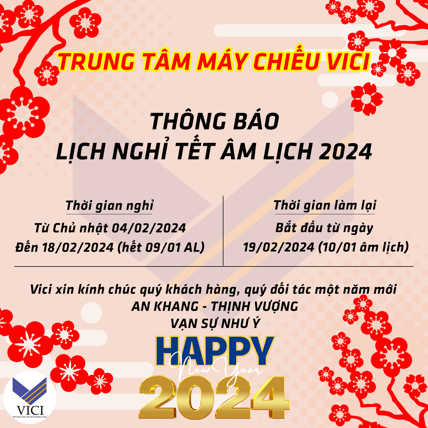 Để thuận tiện trong kế hoạch làm việc giữa Trung tâm máy chiếu Vici và Quý khách hàng, đối tác chúng tôi xin thông báo lịch nghỉ Tết dương lịch của chúng tôi như sau: