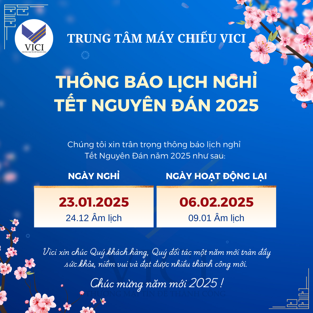 Để thuận tiện trong kế hoạch làm việc giữa Trung tâm máy chiếu Vici và Quý khách hàng, đối tác chúng tôi xin thông báo lịch nghỉ Tết Âm lịch của chúng tôi như sau: